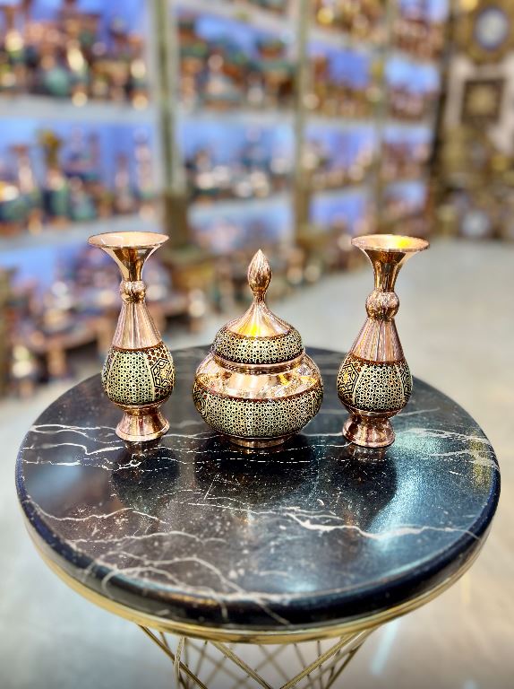 ست جفت گلدان 16cm همراه قندان 16cmمس و خاتم سیم برنجی